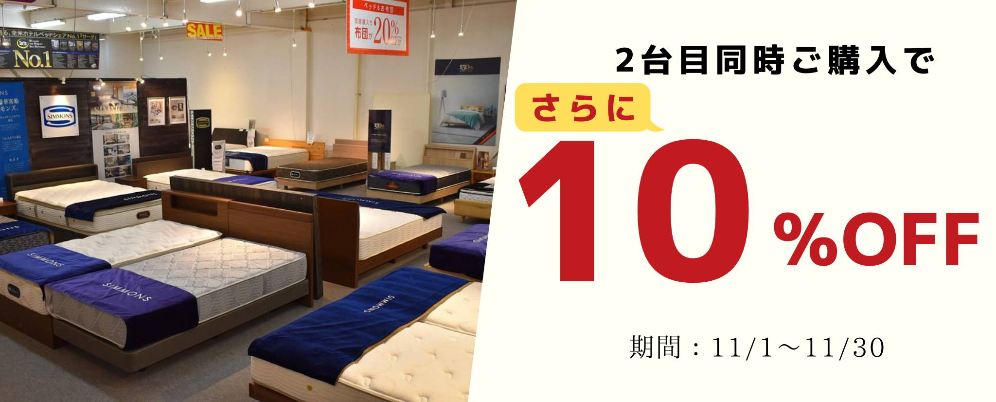 ホーム / news / 【新着情報】2台目さらに10%OFFキャンペーン! ベッド2台同時ご購入でさらに10%OFFの大幅お値引きで大奉仕致します!ぜひこの機会にお越しください!【概要】期間:11月1日(火)~11月30日(水)場所:府中家具の館 2号館〒726-0012 広島県府中市中須町91−2営業時間:8:00〜19:00▶ 同 時 開 催かけ布団ご購入であったかカバープレゼント!足を入れたときにひんやりとする嫌な感じがなく保温性に優れています!お布団やあったかグッズもお見逃しなく!!▶ ブランドベッドフェアはコチラ商品やセールについてのご質問は公式LINEまでお気軽にお問合せください!