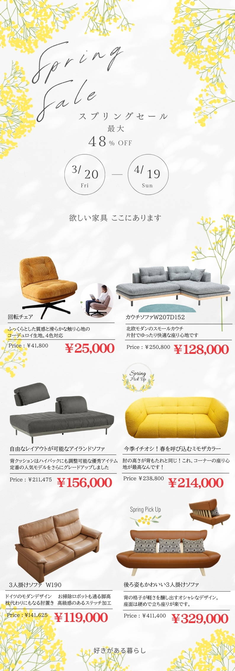 ソファやテーブル中心に広島県東部最大級の品揃えで様々な家具や雑貨展示。