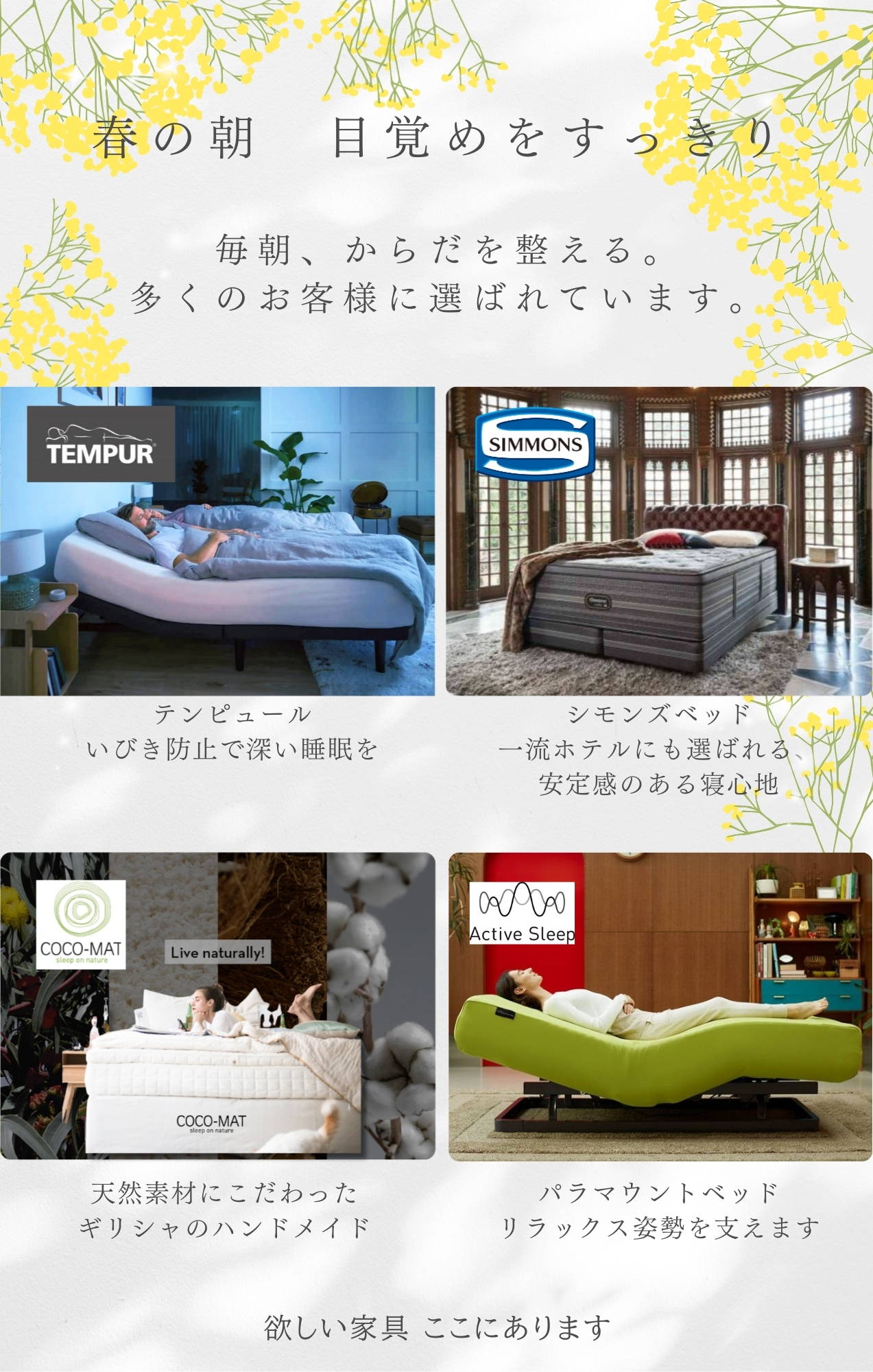 300坪1フロアすべてで、シモンズはじめ国内外ブランドのベッド約70台を展示。