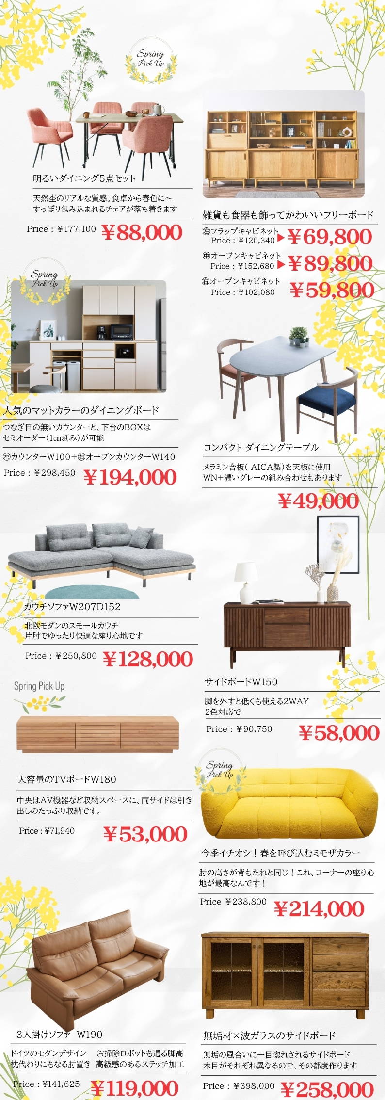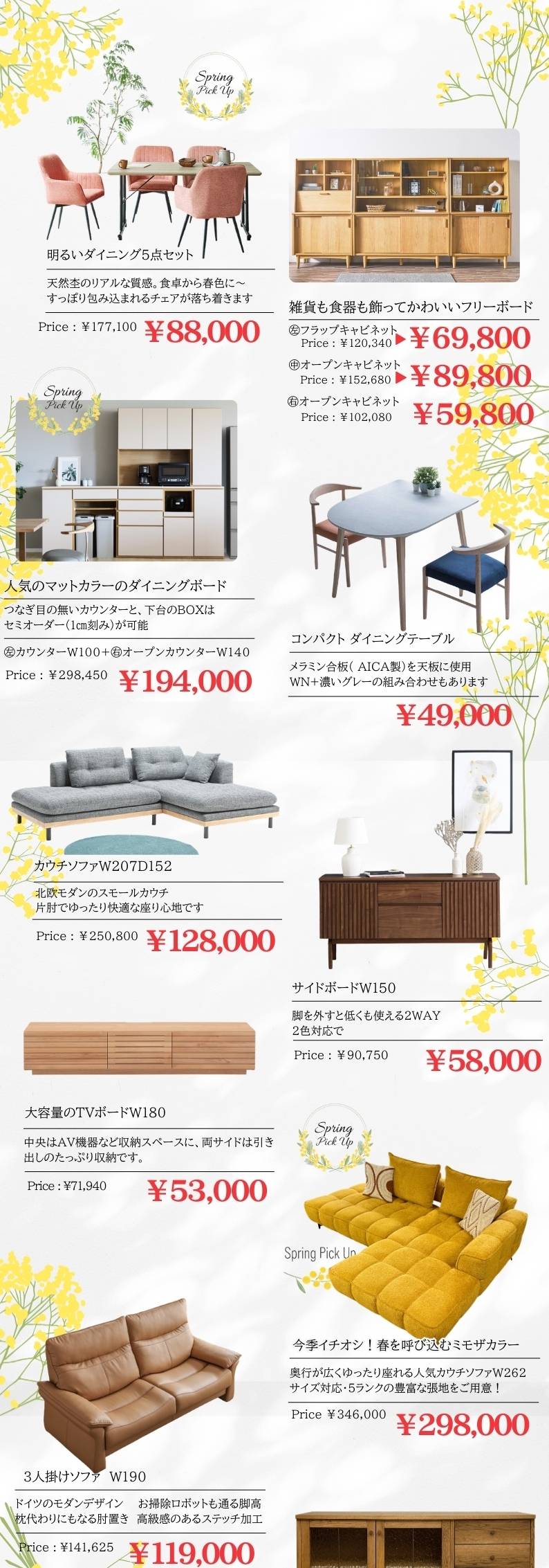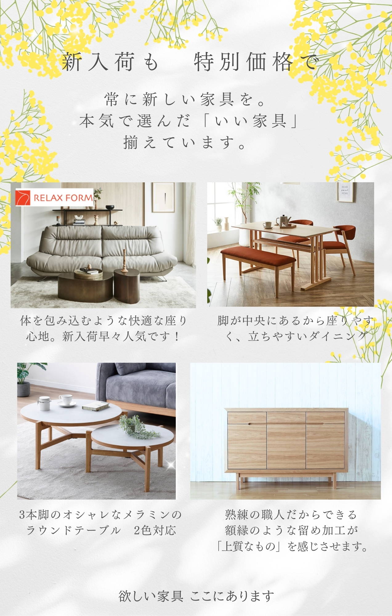 ソファやテーブル中心に広島県東部最大級の品揃えで様々な家具や雑貨展示。