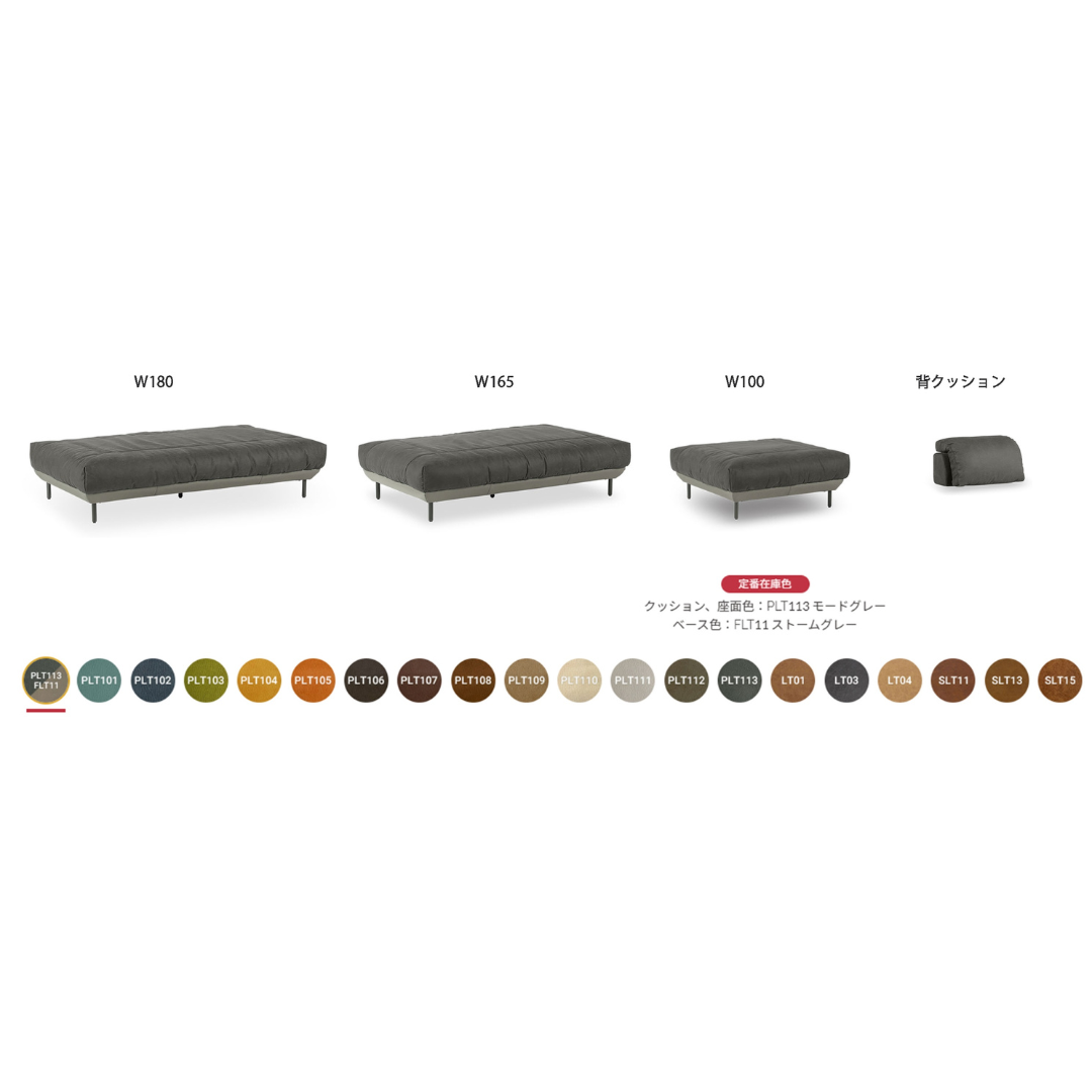 W180 :幅180×奥行101×高さ42(座高42)121,000~138,325(生地ランク) W165 :幅165×奥行101×高さ42(座高42)114,125~130,625(生地ランク) W100 :幅100×奥行101×高さ42(座高42)75,075~85,250(生地ランク) 背クッション:幅72×奥行42×高さ38 42,350~47,575(生地ランク) 生地ランク1-4段階あり
